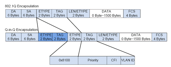 QinQ是对802.1Q的扩展,其核心思想是将用户私网VLAN tag封装到公网VLAN tag中,报文带着两层tag穿越服务商的骨干网络,从而为用户提供一种较为简单的二层VPN隧道。其特点是基于802.1Q协议中的Trunk端口概念,要求隧道上的设备都必须支持802.1Q协议,不需要信令的支持,仅仅通过静态配置即可实现,特别适用于小型的,以三层交换机为骨干的企业网或小规模城域网。QinQ的报文格式如下: